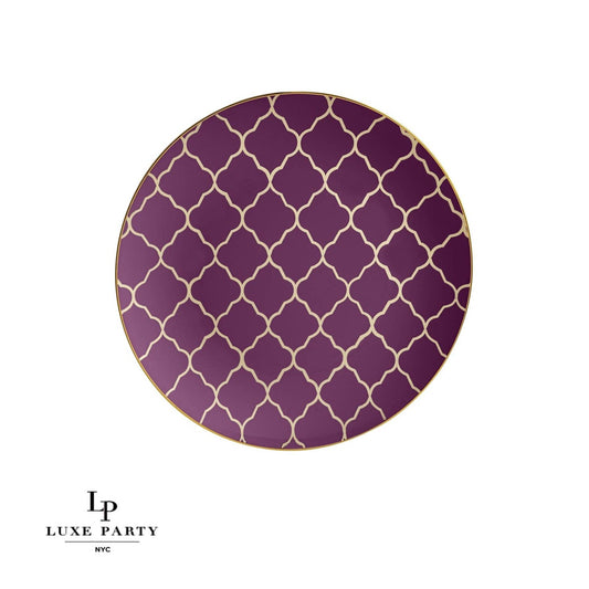 Round Purple • Gold Lattice Pattern Plastic Plates | 10 Pack